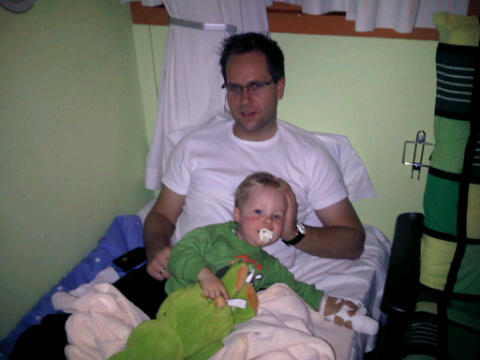 Gisteren hoorden we van de anesthesist dat we na de middag pas als laatste aan de buurt zouden zijn. Des te blijer waren we vanmorgen toen de verpleging zei dat het toch om 10:15u was. Uiteindelijk had de anesthesist gelijk… 🙁 Om 1 uur was Lucas aan de beurt. Papa ging mee in een blauw overall tot aan de operatietafel. Niet leuk om je jongen zo achter te laten 🙁 Na een ruim een uur werden we opgehaald om naar de uitslaapzaal te gaan. Daar lag ons mannetje aan de toeters en bellen. Niet veel later werd hij wakker. Hij had toch wel veel pijn. De OK mensen hebben hem nog 2 keer een beetje morfine moeten geven. Na een tijdje mochten we terug naar de kamer. Dat verliep allemaal een beetje chaotisch. De verpleging was razend druk en Lucas was het niet eens met de katheter en infuusslang die hem ook allemaal pijn deden. Nadat de verpleging eindelijk tijd had en alles goed vastgeplakt zat, viel Lucas in een diepe slaap.