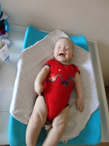 Jawel, ook onze kleinste spruit weet hoe hij moet rollen! Zaterdag 30 april (Koninginnedag) zag mama Roan ineens vanuit haar ooghoek omrollen. Sindsdien heeft hij flink geoefend. Gister was mama de hele dag bezig om Roan weer terug op zijn rug te rollen. Want dat moet de kleine nog leren.