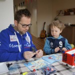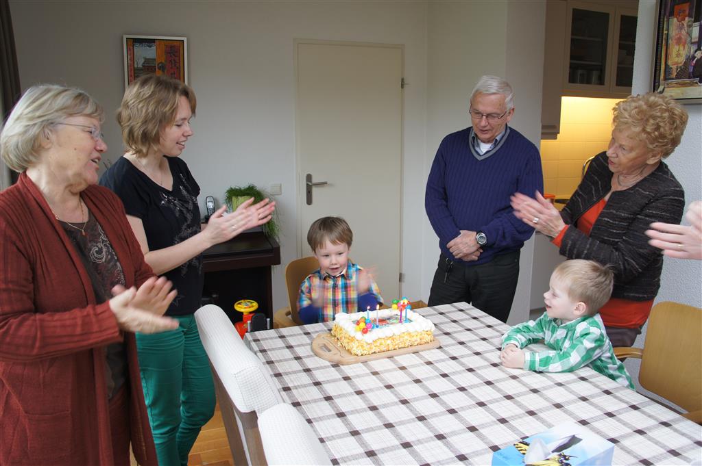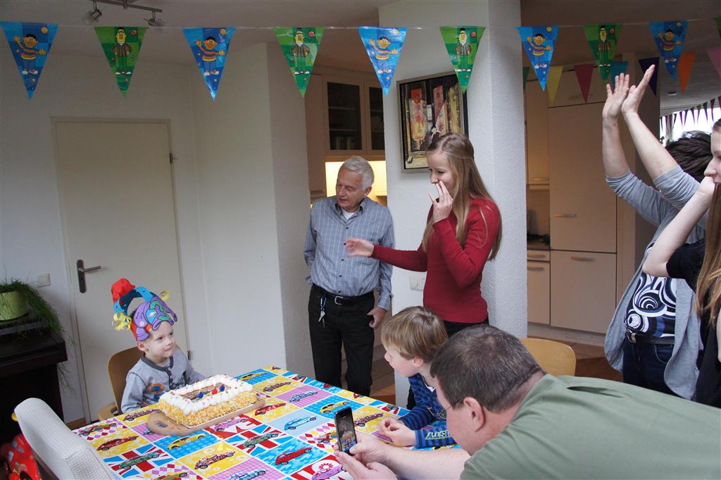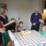 Snel de kleren aan en op pad om de taart op te halen in Budel. Dit jaar wilde Lucas een Chuggington’s taart en die kreeg hij ook. En lekker dat ie was! Om 11 uur waren opa en oma Nesselaar er, samen met Oom Jan en Tante Lenie. En wat nog belangrijkers was, natuurlijk met een berg cadeau’s. Voetbaldoeltjes voor in de tuin en een grote schep voor in de zandbak. Na het uitpakken van deze cadeau’s was het tijd om de kaarsjes uit te blazen. Lucas mocht zelf de kaarsjes op de taart zetten. Mama hielp stiekem een beetje met uitblazen! Ook Roan vond het reuze gezellig allemaal. Zeker toen Julia en Isabelle binnen kwamen! Ook kwamen Frank en Marina even langs voor een stukje taart met koffie! Die brachten een echte koekenbakkers-set mee, omdat Lucas het erg leuk vind om samen met papa of mama iets lekkers te bakken in de keuken.