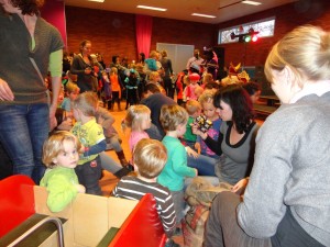 Lucas en mama gingen samen op de fiets naar Kiekeboe. Lucas werd steeds stiller… Uiteindelijk heeft mama hem naar binnen moeten dragen, Lucas met zijn gezichtje verstopt in mama’s hals en zijn oogjes stijf dicht. Dit zou nog wat worden… Maar wederom, toen Zwarte Piet aankwam met pepernoten, was Lucas al heel snel ontdooid. Binnen no-time stond hij te springen en te dansen in de zaal! Mama heeft het geprobeerd te filmen, maar is helaas niet zo handig als papa… Hierbij toch het filmpje. Lucas heeft gezongen en gedanst met zijn vriendinnetje Annabel (het meisje met het blauwe T-shirtje) en rond gerend met zijn vriendjes Tijs en Niels. Eén groot feest!