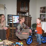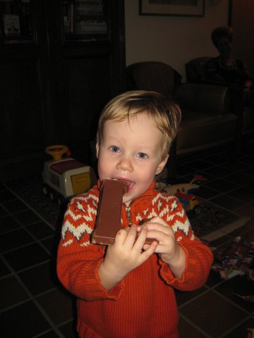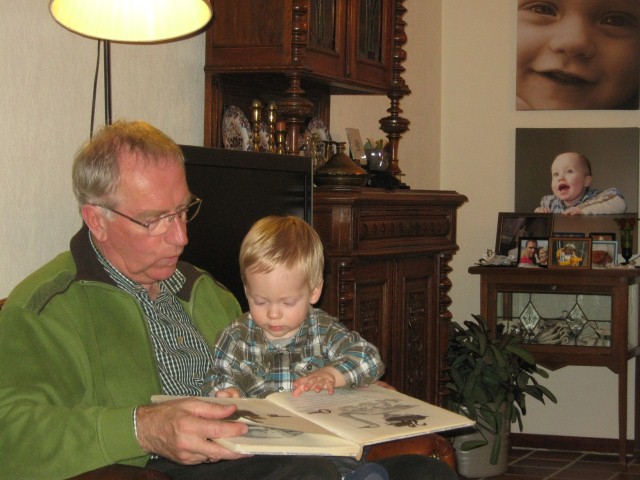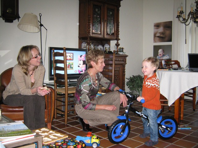 Afgelopen weekend waren we in Zeeland bij opa François en oma Maria om daar met z’n allen Sinterklaas te vieren. Sinterklaas en Zwarte Piet hadden een mand vol kadootjes bij de achterdeur neergezet. Wat een feest! Voor Roan een echte loopwagen en nog een andere auto, voor iedereen een chocoladeletter en voor Lucas een mooie (loop)fiets! Gelijk maar even naar buiten om die uit te proberen! Het zadel op zijn aller laagst! ’s Avonds lekker frietjes eten van oma Maria. Jammie jammie! Eerder die dag waren we al bij oma-oma langs geweest in België. Zondag lekker uitgeslapen (tot 8 uur!) en lekker binnen gespeeld, want het was guur weer buiten. Ook nog even langs opa-opa in Breskens en daarna hebben we allemaal even een lange middagdut gedaan. ’s Avonds na het eten de jongens in pyama in de auto, alle tassen en cadeau’s en terug in de auto naar Maarheeze. Lucas is heel de weg wakker gebleven en heeft wel een uur zitten kletsen. Oh ja, op een gegeven moment zijn papa tegen Lucas: “Jij bent me er eentje”, waarop Lucas zei: “Nee papa! Roan is eentje, ik ben twee !!!” Papa en mama moesten toen heel hard lachen!