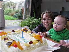 Vandaag is Lucas 1 jaar oud geworden! Wat een leuke dag was dit zeg! Vanmorgen lekker uitslapen bij papa en mama in bed (tot 07:30), want papa had vrij genomen vandaag. Daarna naar beneden. Daar was de woonkamer versierd! Wat een boel vlaggetjes en ballonnen. Lucas was er even ondersteboven van. Zó véél te zien! Papa ging boodschappen doen deze morgen en nog even de zandbak halen die je cadeau gekregen hebt van je opa en oma Geernaert. Leuke bijkomstigheid was de 200kg zand die er bij hoort… Goed geregeld opa! Ondertussen was oma Carla al even langsgeweest met je cadeau, want die kon niet meer wachten: een hele mooie autogarage met autootjes. Wouw! Lucas was helemaal blij. Even dacht hij dat het een ‘loopwagengarage” was… Want alles dat groot en kleurig is de laatste tijd is om achter te leren open. Opa en oma Zeeland kwamen rond de lunch aan in Maarheeze en hebben weer lekker met je kunnen spelen.