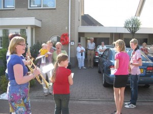 Toen iedereen goed en wel aan de vlaai en de koffie was, hoorden we allemaal ineens een dweilorkest buiten spelen! “Het is toch niet waar, he?” zei oma. Maar jawel, het was echt waar! Opa had een carnavalsbandje gevraagd om buiten op straat voor oma te spelen! Wat was dat leuk!
