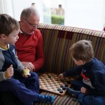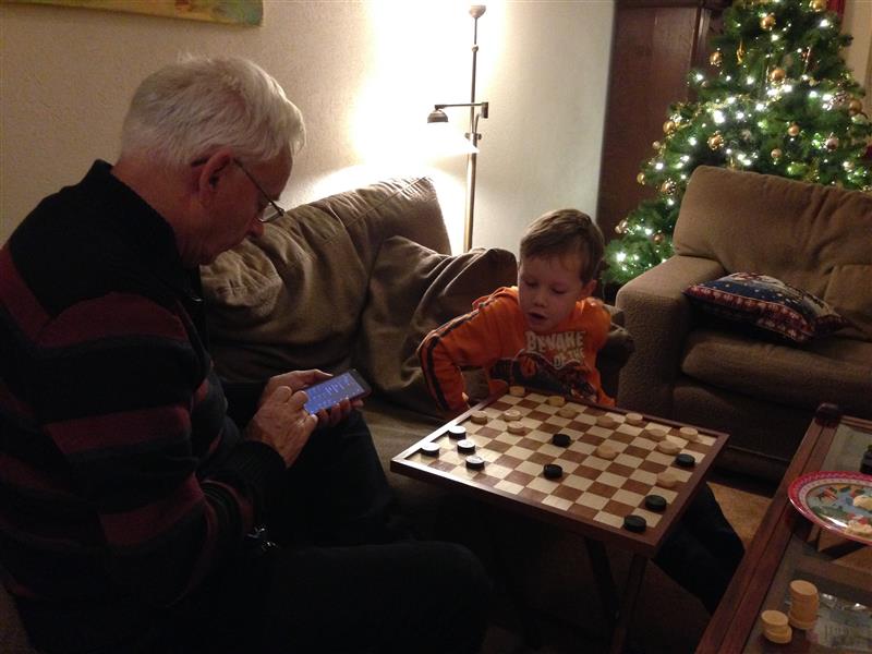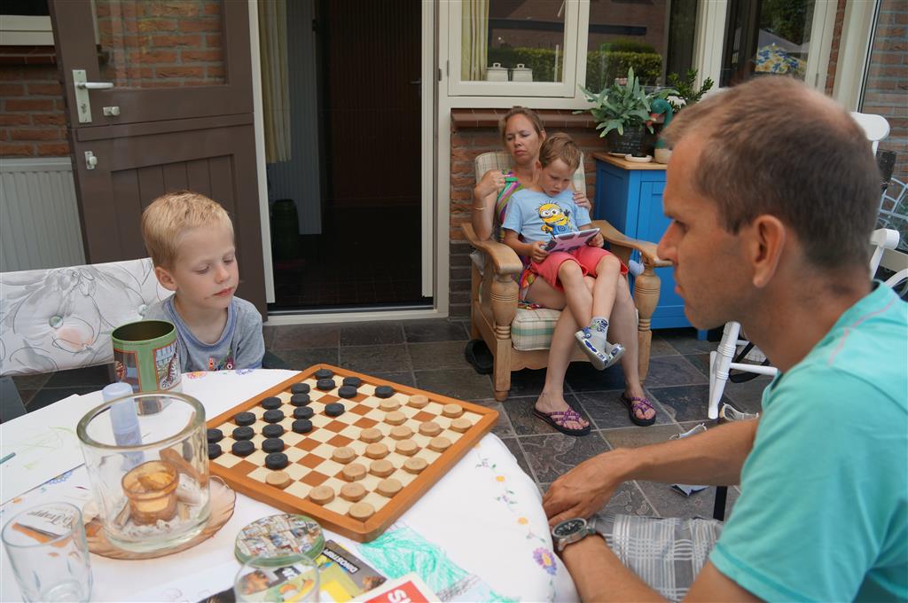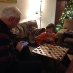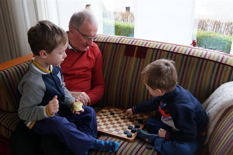 Op kerstavond zijn we naar oma Carla en opa Ries gegaan. Oma had heerlijk eten klaargemaakt en ook voor wat cadeautjes onder de kerstboom gezorgd. De jongens werden daar (wederom) lekker verwend met iedereen een doos “clicks” en een mooi dambord, zodat opa Ries de jongens kan leren dammen. En zo geschiedde. Onder het genot van de zorgvuldig uitgekozen kerstmuziek van opa Ries werd er lekker gespeeld tot het bedtijd was.
