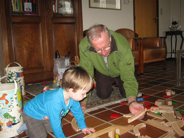 Lucas heeft iedere nacht heerlijk geslapen. Als hij wakker is roept hij naar opa of oma. Meestal is het omstreeks 7.00 uur. Meteen al actief zodra hij beneden is. Spelen met de legoblokken, auto’s, houten trein, filmpjes kijken, bumba spelletjes op de computer. Alles doet hij met veel plezier. Leuk om dat allemaal te zien. De boterhammetjes met chocopasta, hagelslag en aardbeienjam gaan er goed in. Bekertje melk op en daarna opnieuw spelen, spelen en spelen. Als het goed weer is met de loopfiets of tractor naar de speeltuin op het eind van de straat. Lucas krijgt ook bezoekjes, zoals van Tante Suus, buurvrouw Rose-Marie, Tante Ann, Max met z’n papa en mama. We zijn ook op bezoek geweest naar opa-opa en naar oma-oma. Uitstapje gedaan naar een binnenspeeltuin in Breskens waar hij leuk gespeeld heeft. Een rondrit met de auto langs de havens in Breskens. Een bezoekje in het ziekenhuis bij m’n oud-collega’s om onze kleine man te showen. Het doktershuis zegt hij i.p.v. het ziekenhuis. Ook boodschappen doen hoort bij het logeren. Alles vindt hij leuk en als een grote knul doet hij alles wat er te doen valt. Van een grapje houdt hij ook wel.