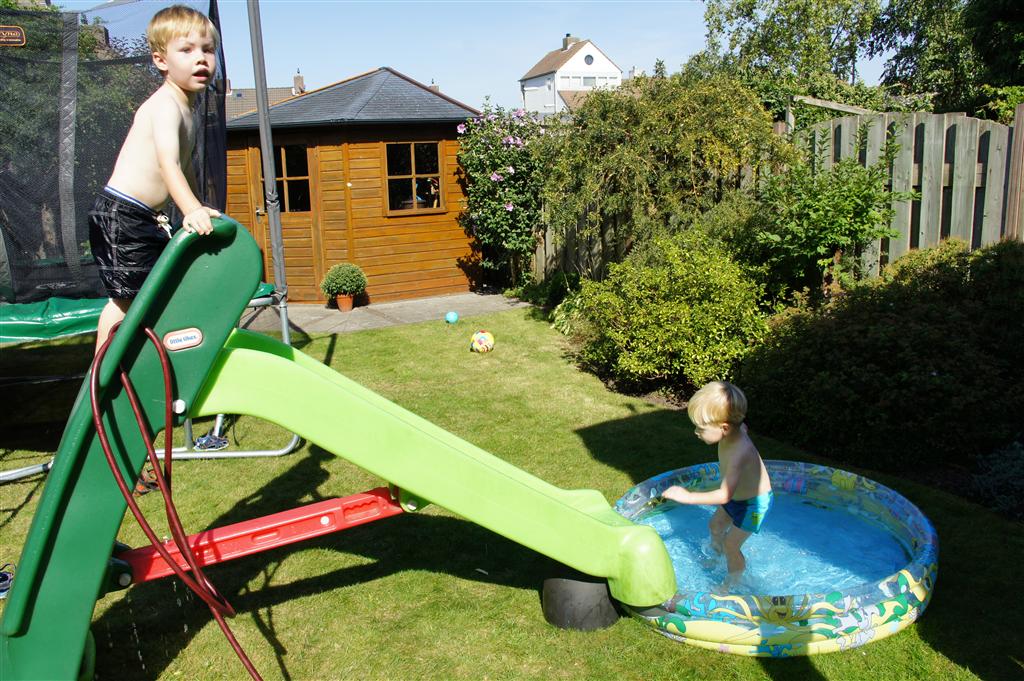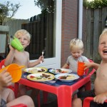 Vandaag kwamen Stan, Tijn en zusje Floor op bezoek bij ons. Het was al weer even geleden dat we samen gespeeld hadden, maar de jongens gingen gelijk met z’n drieën aan de gang, en Roan hobbelde er achteraan. Hanneke, de mama van Stan en Stan zelf, hadden een lekkere kwarktaart gemaakt, die de jongens mochten versieren met snoepjes. Dat was heel erg leuk en ook erg lekker. Na de taart en limonade was het tijd om de zwembroeken aan te trekken. Het was een mooie nazomerdag, met 27 graden op de thermometer. Het zwembadje vol water en de glijbaan er voor zorgde voor een paar uur waterpret. Tussendoor nog met z’n allen op de trampoline en lekker eten en drinken. Aan het eind van de middag ging de barbecue aan en hebben we lekker gegeten met z’n allen. De jongens hebben lekker gespeeld samen en de papa’s en mama’s weer een beetje bijgekletst.