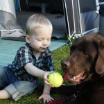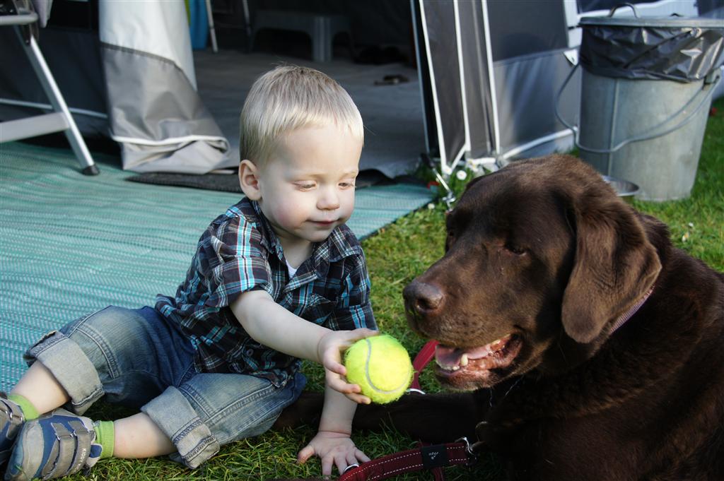 lekker gesmuld van de pannenkoeken, behalve Roan. Die was een beetje ziekjes geworden en had een beetje koorts. Na het eten rolde ook Roan er weer door heen, en konden we nog even allemaal spelen. Roan, grote dierenvriend als hij is, heeft nog leuk met Beau (de hond van Joost & Femke) gespeeld! Dikke vriendjes! Na de afwas was het tijd om in te pakken en terug naar Maarheeze te gaan. Gelukkig was de camping om de hoek, dus waren we zo thuis.