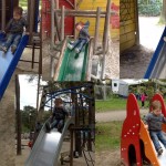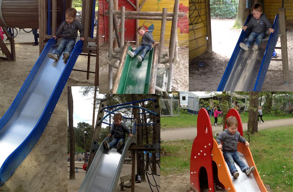 Toen iedereen weer terug was bij de caravan, hebben de papa’s samen Lucas nog even een rondje gelopen over de camping. Op ieder veldje waar we langs kwamen stond een glijbaan, en daar moest natuurlijk van af gegleden worden. Zo veel glijbanen hebben we nog niet zo vaak bij elkaar gezien!