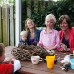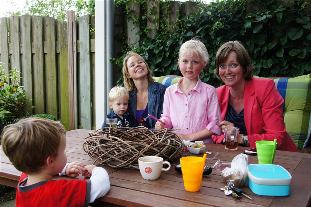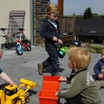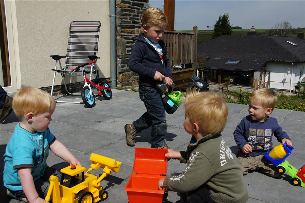 Donderdag was het gelijk al lekker weer. Zo’n beetje de eerste mooie dag van dit jaar. Het bleef eigenlijk het hele weekend heel mooi weer! Iedereen was zelfs een beetje bruin geworden. Van de 4 dagen vakantie hebben we er 3 doorgebracht in de grote tuin van het huis en gewandeld in de omgeving. Lekker voetballen, glijen en klimmen, met de graafmachines spelen, fruit eten en lekker ravotten. Roan is wel 10x op zijn rode autootje van de berg gereden! Ook hebben we een echte speurtocht gelopen en een schat gevonden! Iedere morgen verse broodjes van de bakker en met de hele bubs ontbijten. De papa’s en mama’s hebben bijna iedere avond gebarbequed toen de kinderen in bed lagen en daarna nog tot laat zitten kletsen. Voor de kinderen waren er zaterdag pannenkoeken en zondag frietjes!