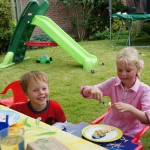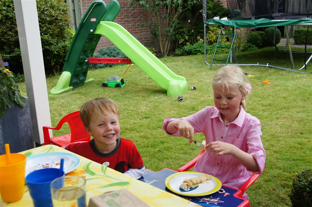 Zaterdag was Roan gelukkig een heel stuk opgeknapt! Hij ging lekker met mama mee boodschappen doen, toen papa met Lucas een ‘verrassing’ ging halen: een trampoline! Omdat Lucas al maanden, zoniet jaren helemaal gek is van trampolines en luchtkussens, heeft papa zijn hand over zijn hart (en portemonnaie) gestreken en een trampoline gekocht. En papa zou papa niet zijn, als hij dan ook niet gelijk een heel goede en mooie trampoline zou kopen! Zaterdagmiddag, nog tijdens het opzetten, kwamen gelijk al de buurkinderen Anouk (bijna 4) en Tim (bijna 8) langs, om samen de trampoline in te wijden: goedgekeurd! Aan het einde van de middag kwam ook mama’s neef Marc met zijn zoontje Eddie (4 jaar) langs om te springen. Daarna lekker gebarbecued bij oma Carla. Daar waren Angela en Abel (bijna 1) ook al, samen met hun opa en oma Jan en Leni (opa’s broer en schoonzus). De kinderen hebben heerlijk met elkaar gespeeld en heel veel stukjes stokbrood gesnoept. Het was heel gezellig!
