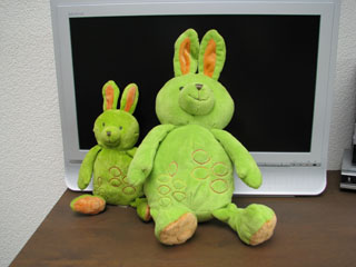 Lucas heeft een mooi groen konijn waar hij helemaal gek op is. Eigenlijk zijn lievelings knuffel. We zijn al een tijdje op zoek naar nog zo’n exemplaar, maar helaas is dit konijn nergens meer te krijgen. Gisteren nog wat zitten surfen op het internet en uiteindelijk dacht ik ‘m gevonden te hebben… totdat hij vandaag thuis afgeleverd werd… Deze bleek toch een stuk groter. Straks gaat papa even proberen of Lucas het opvalt dat het een andere is 😉
