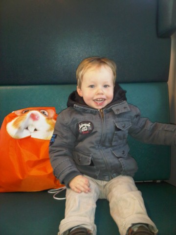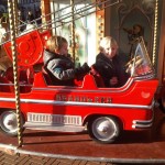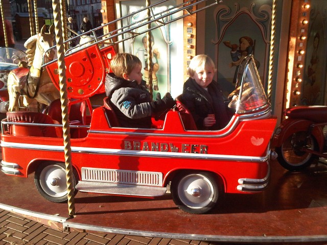 Eenmaal in Eindhoven eerst even een paar keer op de roltrap de fietsenkelder in en uit. Daarna richting de markt, waar Stan aan het shoppen was met zijn ouders. Onderweg nog gestopt en een stikkerboekje en knutselboekje gekocht voor Lucas en Roan. Op de markt stond (zoals altijd) een draaimolen! Eerst even de kat uit de boom kijken en toen een kaartje gekocht. Maar helaas, Lucas durfde er toch niet in. Ook niet samen met papa. Maar toen kwam Stan aangelopen! Natuurlijk wilde Stan (die een stuk avontuurlijker is dan Lucas) wel in de draaimolen. Toen Stan eenmaal een rondje gedraaid had, durfde Lucas het toch ook wel. Dus samen met Stan de brandweerwagen in! En Lucas vond het gelukkig heel erg leuk. Toen was het tijd om wat te drinken. Chocolademelk! Lucas heeft even geproefd, maar vond het toch niet zo lekker. Dus dan maar appelsap. Lucas en Stan hebben lekker gespeeld in het café en Robert en papa konden even bijpraten. Pas toen Stan en Lucas de hele zaak op zijn kop aan het zetten waren, was het weer tijd om naar buiten te gaan. Stan weer verder met winkelen en wij met de trein naar huis.